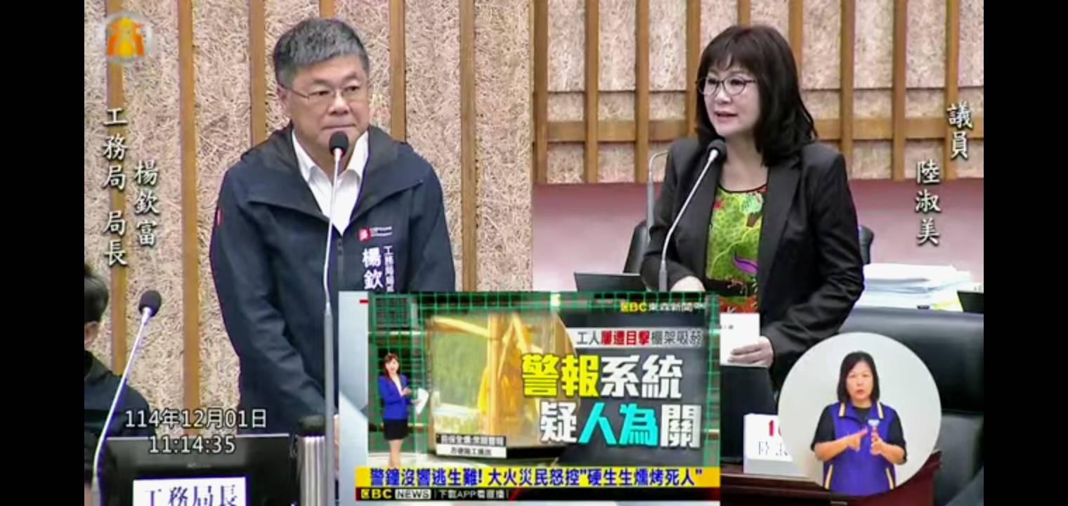 工務局長楊欽富表示,建築物防火方面,目前施工鷹架防護網僅規範防塵及防墜落,防焰方面將建請中央修法;內部則要落實完善消防警報系統。陸議員不滿認為,「人命關天」不應等待中央修法。