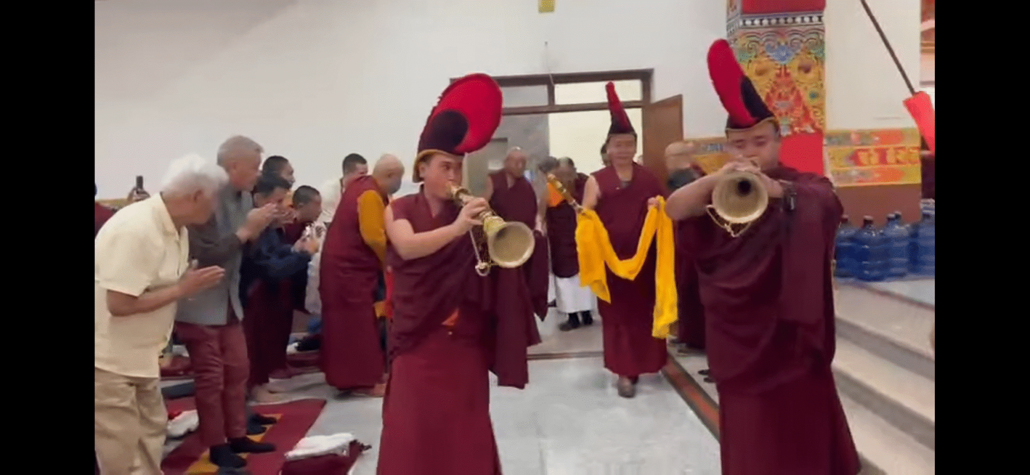 法會現場,伴隨傳統薩迦儀仗、法號、長號與祈願香燈,殿堂莊嚴肅穆。