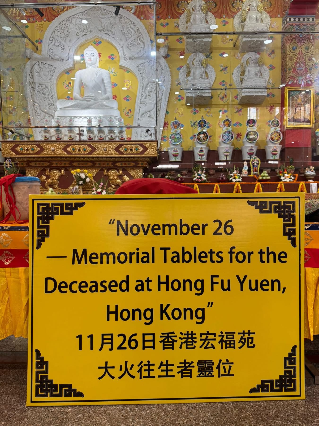 此次法會由薩迦文殊佛學會至誠祈請,兩位法王慈心應允,親登法座,率領僧眾誦修《普賢行願品》等超度與迴向儀軌,並特別設立「香港宏福苑大火亡者靈位」供大眾共同祈禱。