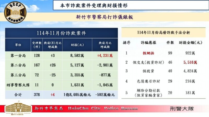 【焦點時報/記者羅蔚舟報導】新竹市警察局今(4)日公布114年11月份受理民眾詐騙現況:統計顯示,11月全市受理詐欺案件378件,財損金額新臺幣(以下同)1億8,695萬餘元,受理數及財損數與去年同期相比分別下降25.66%及52.82%,顯示整體新竹市打詐行動逐步奏效。