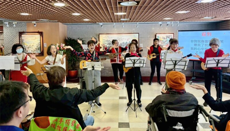 【今傳媒/記者簡勻青報導】長庚養生文化村策畫「百歲畫愛 院望啟程」畫展,展出創世基金會創辦人曹慶先生多幅獨具特色的「棉棒」畫作。今(4)日上午十點舉行開幕茶會,在養生文化村烏克麗麗班歡樂的演奏中揭開序幕,高齡百歲的曹慶先生分享創作過程與公益理念,也將義工親手編織的毛帽送給養生村的6位百歲人瑞,現場溫馨感人。