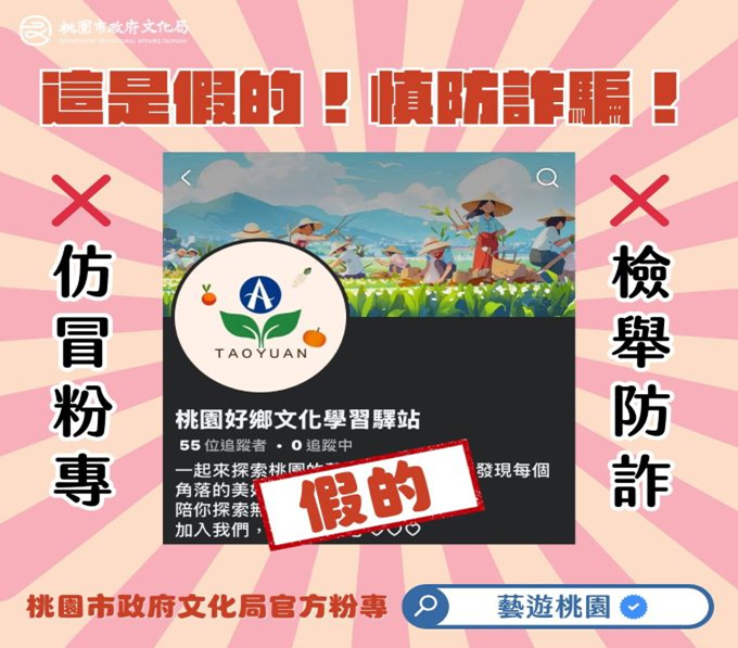 欲了解文化局最新消息及活動資訊,請以桃園市政府文化局官方網站及認證粉絲專頁「藝遊桃園」公告為準,勿輕信來路不明訊息。文化局感謝各界的關心與提醒,後續將持續追蹤處理進度,並加強社群帳號的安全防護機制,確保民眾權益不受損害。更多詳細資訊請查詢:「桃園市政府文化局官網」https://culture.tycg.gov.tw/。「藝遊桃園Facebook粉絲專頁」https://www.facebook.com/tyccc.gov。「藝遊桃園Instagram粉絲專頁」https://www.instagram.com/tycccgov/。「藝遊桃園Youtube頻道」https://www.youtube.com/@tyculture。(圖:文化局提供)