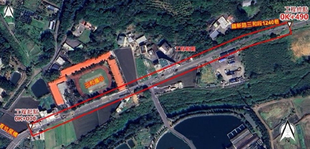 桃市府工務局表示,本工程範圍自霄裡溪起,向東延伸至龍新路三和段1240巷,全長約490公尺。工程內容包含道路拓寬至8公尺、AC刨鋪、側溝新建等,將現有單車道雙向通行提升為雙車道雙向通行配置,使車流量更順暢、安全性也大幅提升。此外,為改善路段照明、保障夜間行車視距,沿線將新設17盞智能 LED 路燈,形成更加完善的安全光環境。桃市府並考量三和國小位於道路沿線,同步改善友善通學設施,包括新設長度19公尺、寬1至2.7公尺的實體人行道、70公尺長的標線型人行道,以及家長接送區,提供家長接送更有秩序、學童步行更安心的通學環境。同時於工程區域增設1處消防栓,以符合消防救災需求,提升緊急應變能力。