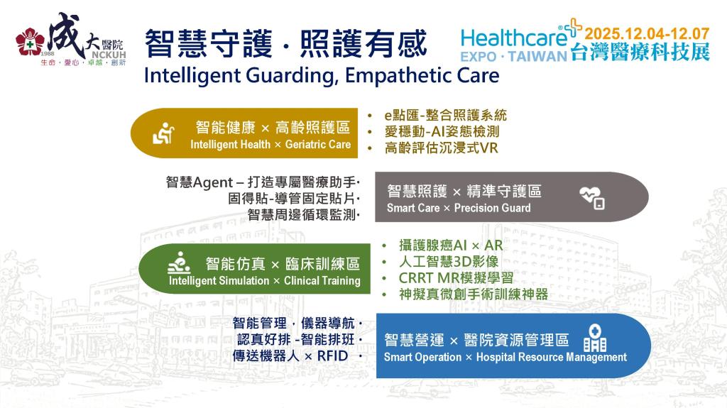 成大醫院表示,本次展出13項創新成果,展現醫院在智慧照護、精準訓練與營運管理上全方位進展;未來持續深化跨領域合作與臨床驗證,使科技真正轉化為病人安全與照護品質提升,推動智慧醫療和創新成果進入臨床與國際。