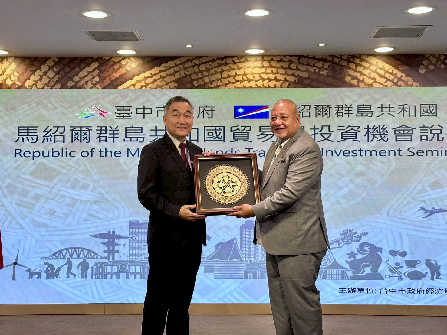 台中市政府與馬紹爾群島共和國共同主辦之「馬紹爾群島貿易與投資機會說明會」,今(9)日上午於台中市政府台中廳舉行。馬紹爾群島自然資源暨商業部穆勒(Tony Muller)部長率領官方與產業代表訪團出席,副市長黃國榮代表市長盧秀燕及在地企業交流,聚焦貿易、觀光、農漁業、建設及投資等領域合作。另響應台中購物節熱潮,同場邀請部長與貴賓抽出「台北—馬紹爾機票」,並熱情邀請幸運得主蔡小姐飛到馬紹爾,體驗當地觀光風情。
