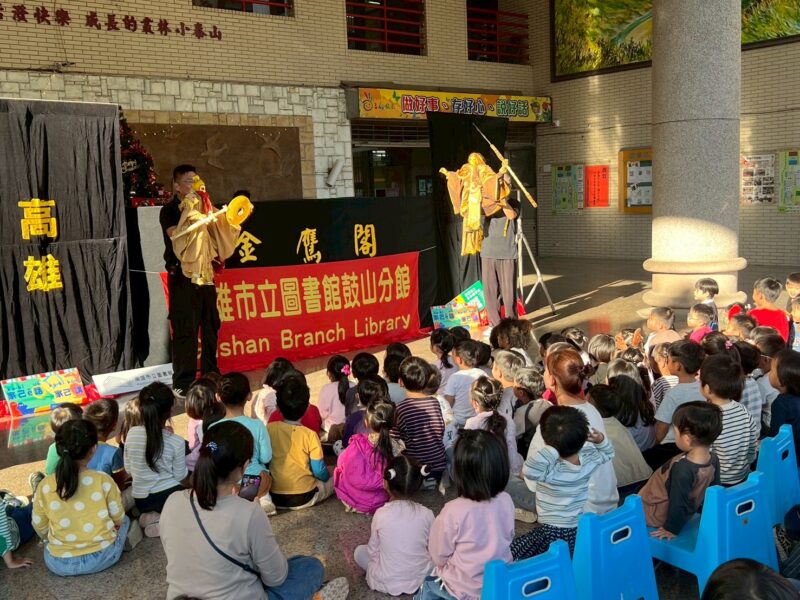 鼓山圖書館12月12日舉辦「入棚尬台語」活動,邀請南臺灣知名的「金鷹閣電視木偶劇團」前往楠梓翠屏非營利幼兒園,演出熱鬧的主題式互動布袋戲《跟著偶來學臺語、跟著偶來逞英雄》。金鷹閣團長陳皇寶率領榮獲十三年高雄市傑出演藝團隊殊榮的團隊上陣,將校園瞬間化身小小戲棚,以最親民、最可愛的方式,將台灣布袋戲文化的精髓扎根在孩子心中。