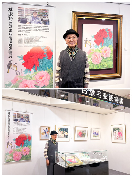 現年88歲的蘇服務,國立台灣師範大學藝術系畢業,師承國寶級膠彩畫大師林之助和許深州,作品高雅如詩、色彩清麗優雅璀璨剔透,膠彩數位微噴版畫更是價格親民友善收藏。歡迎大家到豐原太百、享受最好康的購物回饋和最藝術的耶誕氛圍。
