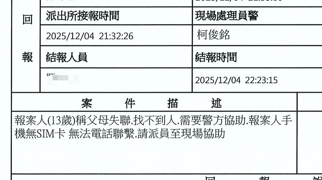 臺中市政府警察局第五分局北屯派出所於114年12月4日21時32分接獲110報案,一名13歲國中女學生表示返家後無法聯繫父母,疑似失聯,請求警方協助。由於報案地點位於北屯路64號前,距離派出所不遠,警員柯俊銘獲報後立即徒步趕往現場關心。