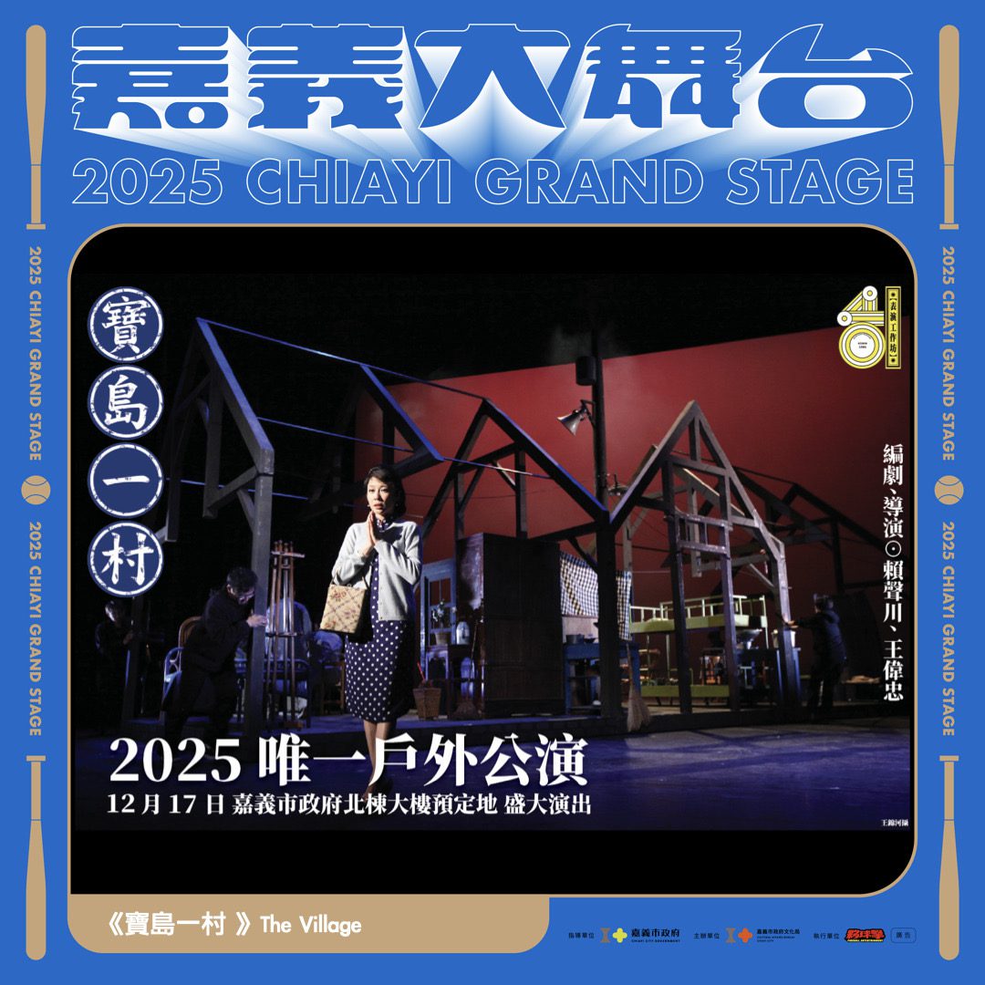 12月17日演出的《寶島一村》由賴聲川與王偉忠共同編導,改編自王偉忠成長於嘉義眷村的生命經驗,以舞台上的三間小房子,細膩描繪大時代裡的小人物故事。自 2008 年首演以來,巡演遍及世界各地,被譽為臺灣近年最具代表性的劇場經典之一。本次於嘉義以戶外形式呈現,不僅別具意義,更讓劇中熟悉的人情、方言與生活聲響,與城市真實的晚風、街景交織,邀請觀眾在開放空間中,貼近感受屬於臺灣的共同記憶。