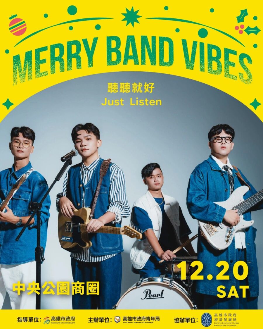 週六下午5時至晚間8時30分登場的「Merry Band Vibes」音樂展演,將由青年局「高速青春」培育樂團擔綱演出,包括「聽聽就好 Just Listen」、「津波 Tsunami」領軍開唱,並串聯「雄校聯」的校園音樂能量,由福誠高中熱音社、道明中學民謠吉他社及小港高中熱音社接力登台,以青春樂音點亮中央公園玉竹商圈,展現校園社團與城市街頭接軌的音樂動能。