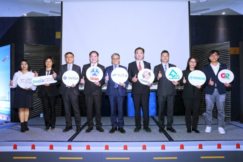 ▲圖由左至右:精密機械研究發展中心周麗蓉副總經理、台灣電子製造設備工業同業公會張雁媜副秘書長、中華民國對外貿易發展協會周秀隆副秘書長、台灣機械工業同業公會莊大立理事長、經濟部國際貿易署劉威亷署長、台灣工具機暨零組件工業同業公會林松益副理事長、臺灣木工機械工業同業公會涂旻聖常務理事、社團法人台灣智慧自動化與機器人協會朱盈勳副秘書長、臺中市機械業二代協進會張為鈞會長。(圖/主辦單位提供)