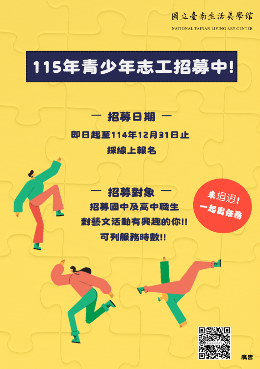 國立臺南生活美學館打造青少年藝術育成基地,提供青少年視覺、表演藝術的育成平台。為擴大參與,即日起招募國、高中職青少年志工。青少年志工將於115年1月31日(六)進行1日的培訓,由台南人劇團團長李維睦、劇作家暨導演王友輝、策展人國家文藝獎得主吳瑪悧與青少年志工一起玩遊戲,培訓後自115年3月起開始輪值服務,協助民眾體驗展覽互動裝置,與觀眾交流,讓青少年志工有機會以自己的一句引導、一個動作,成為文化場域中最有能量的存在,臺南生活美學館歡迎國、高中職青少年們踴躍報名參加,一起成為「遊戲夥伴」。