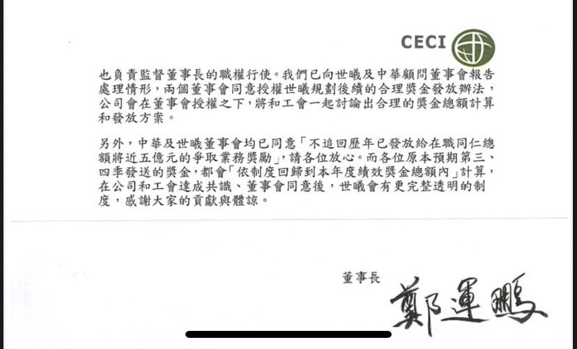 至於員工關切的既有獎金,鄭運鵬強調,董事會已決議不追回歷年已發放給在職同仁、總額近5億元的業務獎勵;原預期於第三、第四季發放的獎金,則將納入年度績效獎金制度統一計算,未來將在董事會授權下,與工會共同研擬更透明、合理的獎金發放機制,感謝大家的貢獻與體諒。
