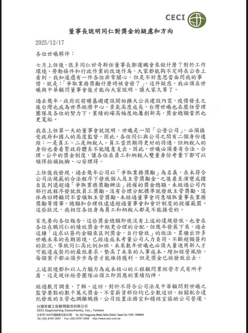 前民進黨立委鄭運鵬今年7月出任台灣世曦工程顧問公司董事長,上任後即啟動制度檢討與內控改革。他於17日以「董事長說明同仁對獎金的疑慮和方向」為題,向全體員工發布公開信,首度對外說明公司長年獎金制度失序的狀況,並坦言已追回數千萬元不符規定的獎金,同時承諾不追溯回收歷年已發放、總額近新台幣5億元的業務獎勵,引發外界對世曦內部治理的高度關注。
