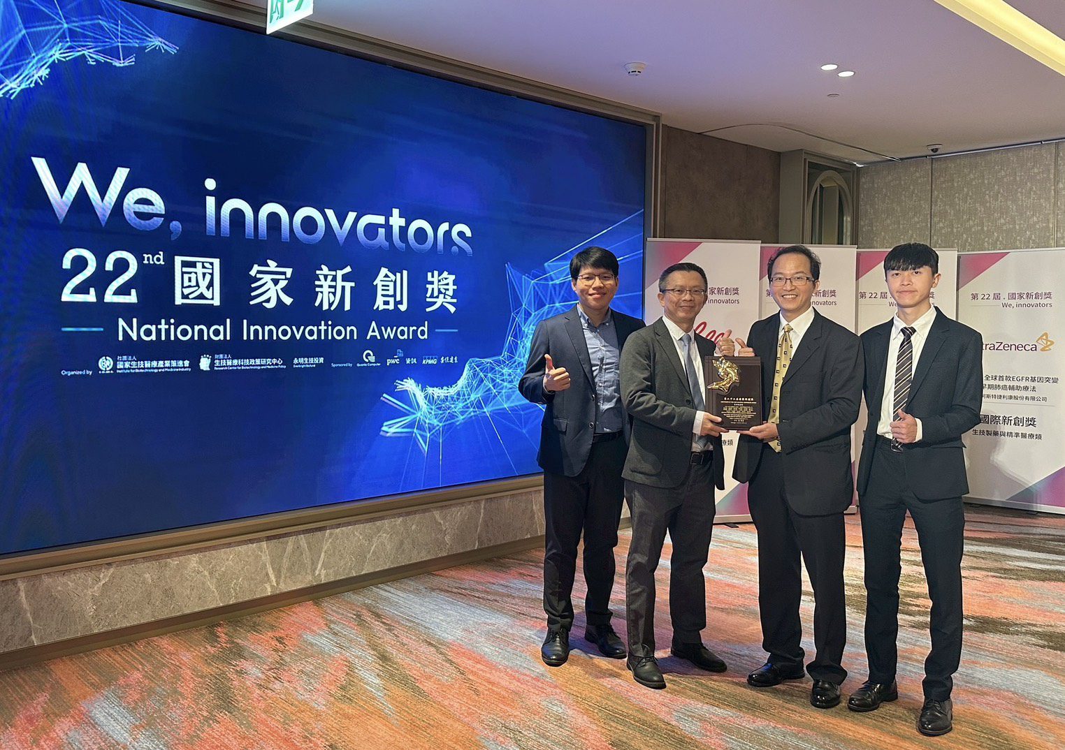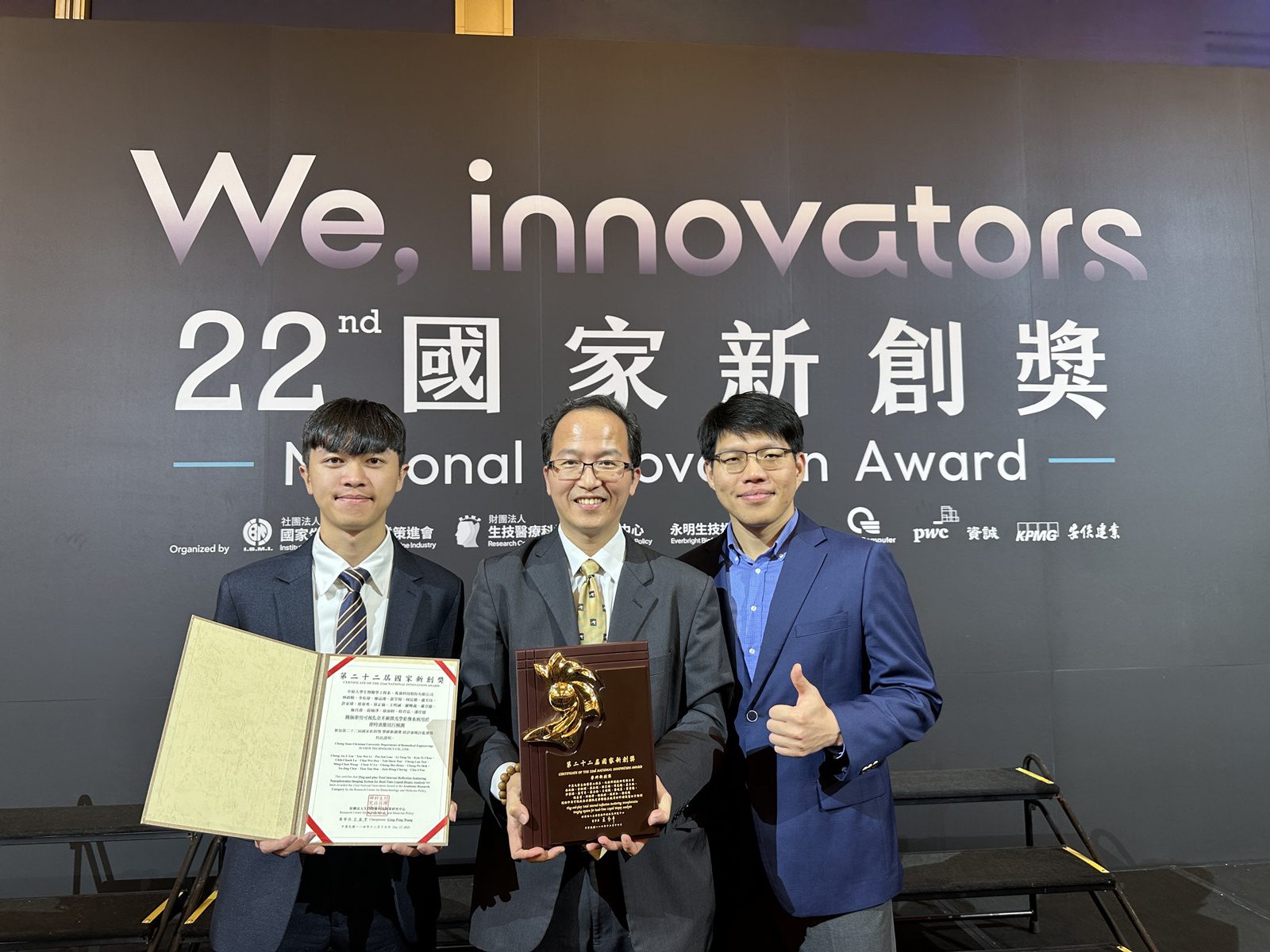 國家生技醫療產業策進會於12月17日下午在台北漢來大飯店舉行國家新創獎頒獎典禮,該獎項為國內生醫與大健康領域創新競逐的指標榮譽。中原大學醫工系林政鞍團隊與兆強科技產學合作,在歷經半年、三階段的嚴格評選後,自眾多參賽團隊中脫穎而出,獲頒本屆國家新創獎「學研新創獎」(創新醫材與診斷技術類),肯定其具有新創價值與應用效益,典禮上由國科會生命科學研究發展處處長楊台鴻頒獎表揚。