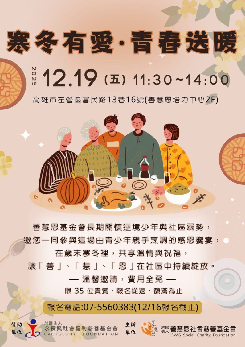 在制度教育之外,仍有一條陪伴孩子走回人生正軌的路。由財團法人善慧恩社會慈善基金會舉辦的「寒冬有愛.青春送暖──114年技職能成果發表會」,12月19日於高雄市左營區善慧恩培力中心溫馨登場,不僅展現逆境少年在技職訓練上的具體成果,也讓社會看見「陪伴」所帶來的真實改變。