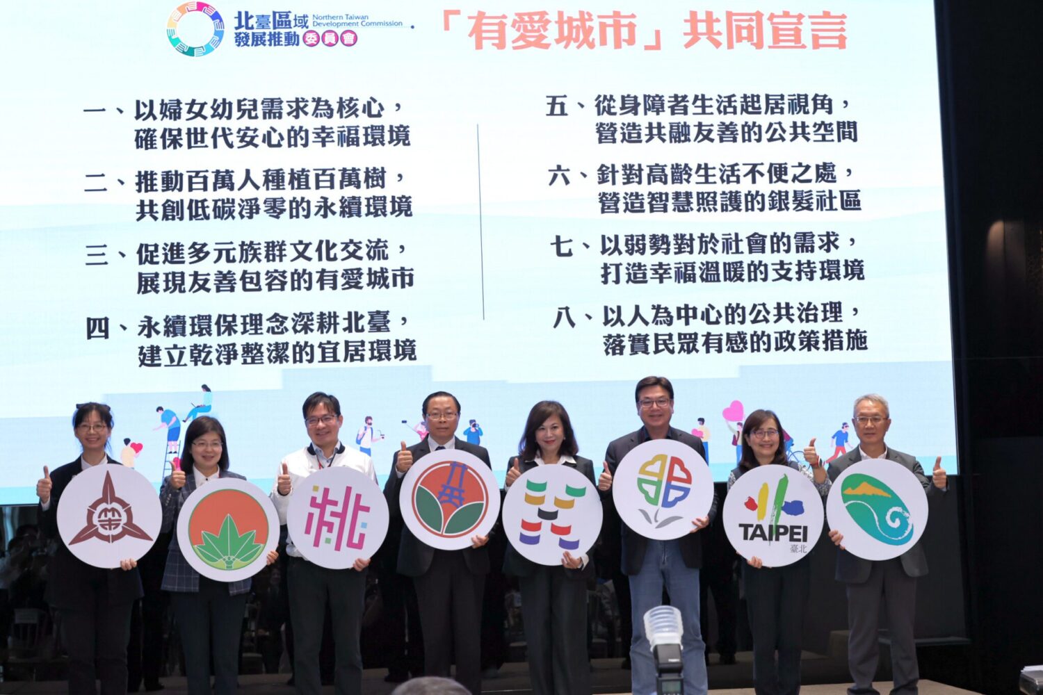 會議最後,由北臺8縣市代表共同簽署「有愛城市合作宣言」,彙整各議題組年度合作精隨,涵蓋全齡友善、智慧照護、永續環境、多元文化交流等八大核心面向,作為未來持續深化區域合作的重要指引。