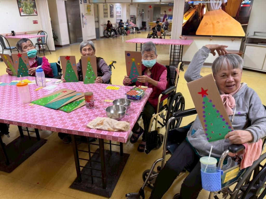 在聖誕主題佈置與音樂陪伴下,榮家住民長輩一邊創作、一邊分享過往過節回憶,熟悉節日元素不僅喚起美好記憶,也讓長輩從中獲得情緒安撫與安全感。