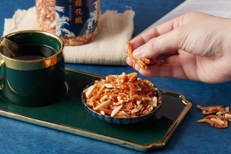 另一款年節熱銷商品「特級杏仁櫻花蝦」,採用東港特A級外銷日本規格櫻花蝦,搭配手炒杏仁與芝麻,香氣濃郁、口感酥脆。櫻花蝦素有「海中紅寶石」美譽,象徵富足好運,為年節禮盒增添吉祥寓意。