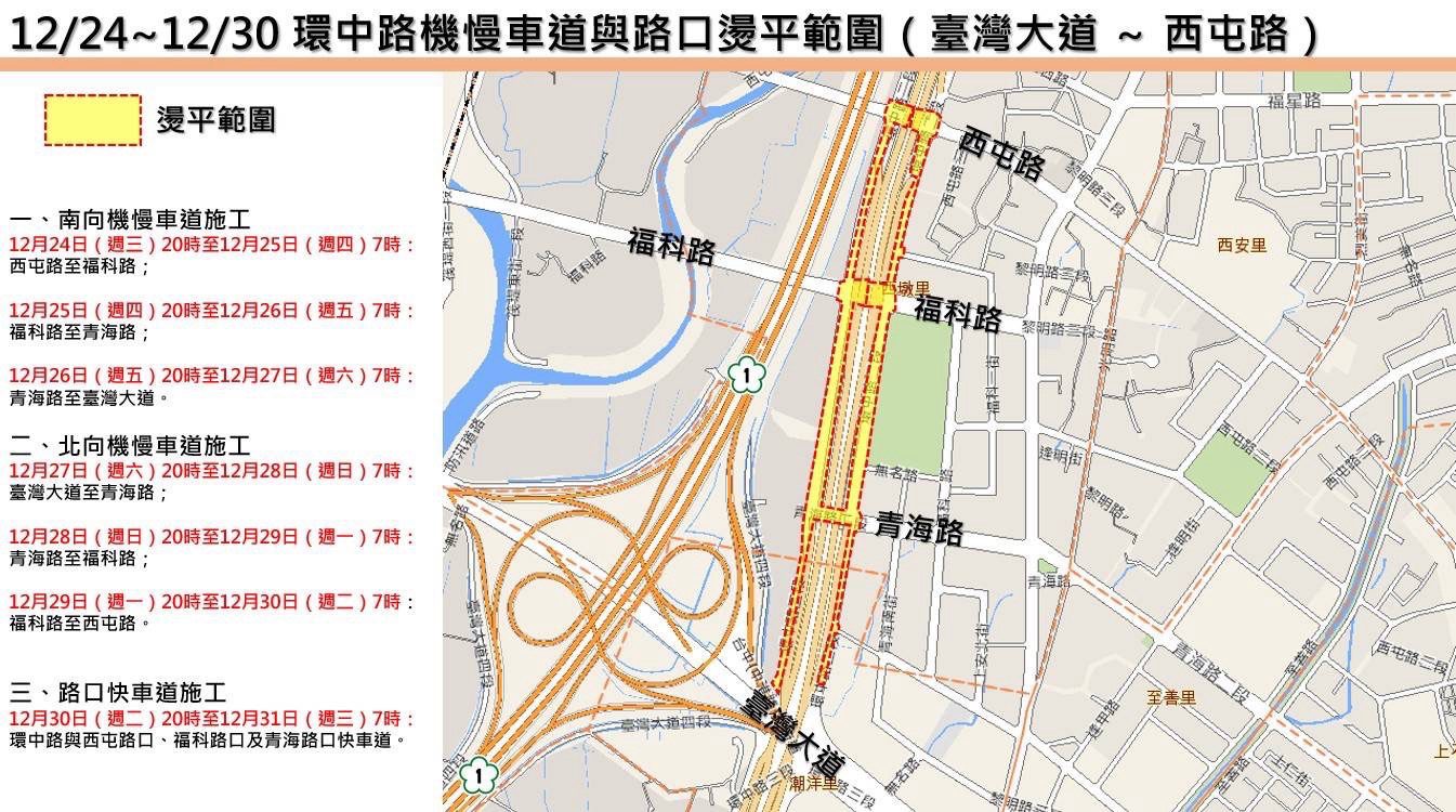 用路人注意! 西屯區環中路12/24起分段夜間燙平 台74線閘道同步交通管制