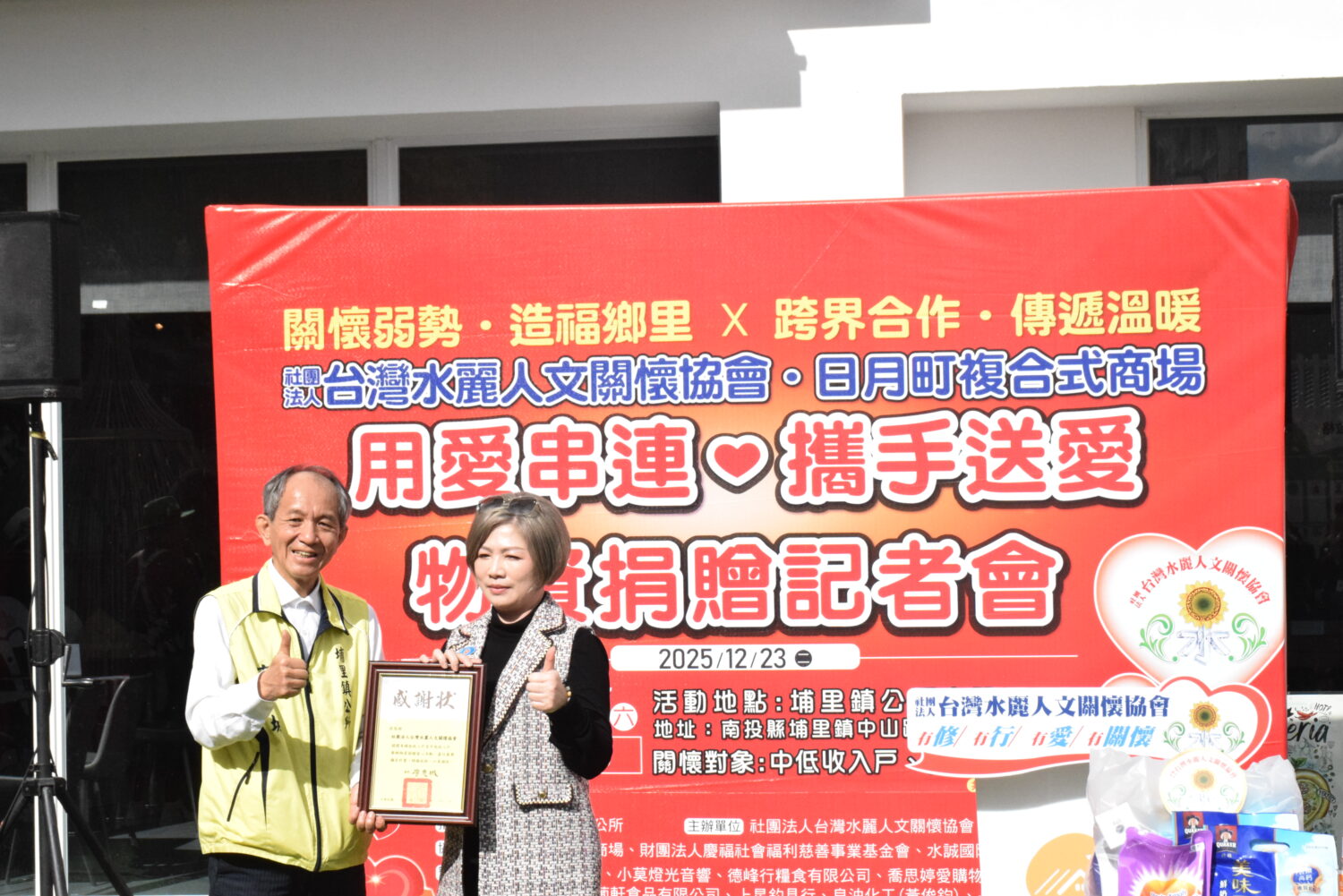 本次由埔里在地業者日月町複合式商場協辦,首度將愛心資源帶進山城埔里,關懷弱勢民眾。結合財團法人慶福社會福利慈善事業基金會、社團法人高雄市八方義行團關懷協會及水誠國際股份有限公司,募集的愛心物資包括白米、醬油、罐頭、保久乳、關廟麵、哈密瓜多多酥、沖泡麥片、衛生紙及家庭清潔劑等豐富的民生用品。