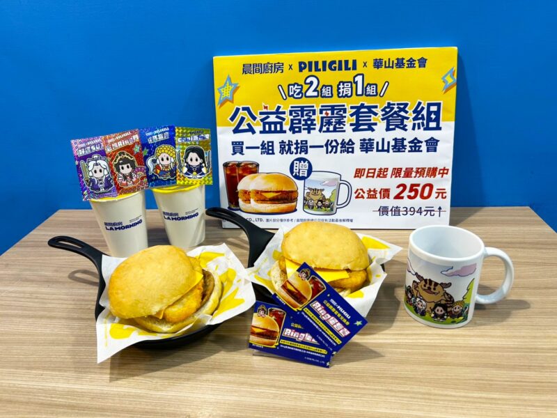 除了優惠套餐外,晨間廚房也同步推出 「公益霹靂套餐組」,每組售價 250 元(含RING堡-豬肉薯餅起司堡套餐組與限量霹靂馬克杯)。凡購買公益套餐,品牌即加碼捐出早餐基金,透過華山基金會轉贈給獨居長者,讓寒冬中的長輩也能享有一頓溫暖的早餐。