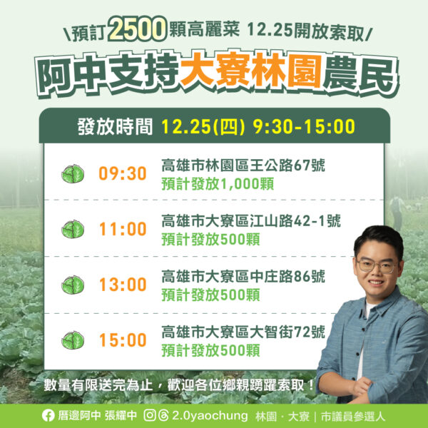 數量有限送完為止,歡迎各位鄉親踴躍索取,一起來支持小農,來吃我們高雄最美味的高麗菜!