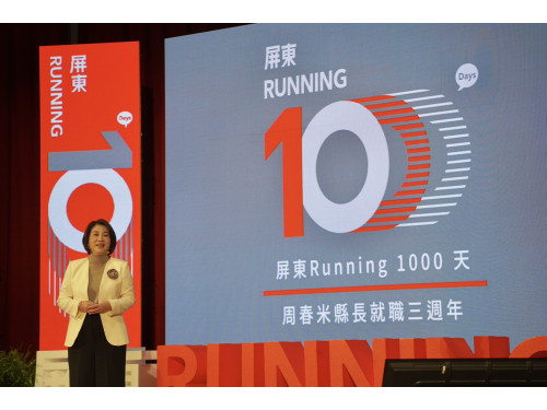 走進縣府迎面而來就是「屏東running1000」主題,突顯出周縣長3年1000多個日子的心情:「千日努力,淬鍊成一股溫暖而強大的力量,推動屏東迎向未來!」;現場播放的影片更如同跑馬燈般,快速呈現各項施政成果,不論社福、長照、教育、文化、觀光、建設、產業、到屏東獲得榮耀肯定等,「好屏,看得見」,一幕幕都觸動人心。