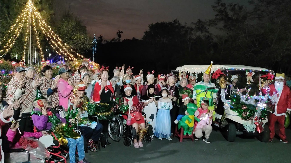 傍晚時分,隨著天色漸暗,現場燈光悄然熄滅;在一片期待中,精心裝飾聖誕雪橇車伴隨著輕快聖誕歌曲緩緩進場,瞬間點燃現場氣氛;隨後,點燈儀式正式啟動,家主任姚辰蕙與住民代表共同按下啟動鈕,園區內聖誕樹與周邊燈飾瞬間綻放璀璨光芒。