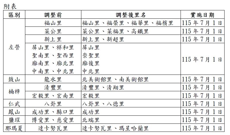 【News586/記者張淑慧報導】高雄市推動里鄰編組調整,經充分與地方溝通及行政審議程序後,計有左營、楠梓、鼓山、仁武、鳳山、鹽埕及那瑪夏區等7區21里之里調整方案經市府核定,合計新增10里、裁併7里,預計自115年7月1日生效。