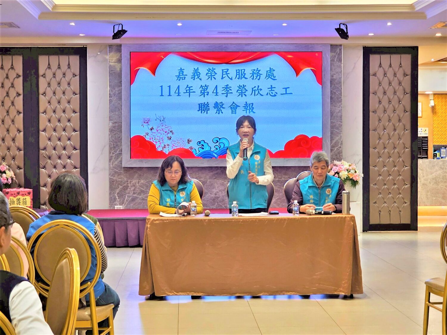 聯繫會報首先播放志工一年來的服務影片,記錄服務過程中的點滴與感動,展現志工們付出的辛勞與堅持,與會志工深受觸動,也更加體認志工服務的價值與意義;許處長致詞時表示,嘉義榮服處於今年輔導會舉辦之績優志工表揚大會中,榮獲「績優志願服務運用單位」、「績優承辦人員」、「績優社區志願服務組長」、「資深榮欣志工」及「救災有功運用單位」等多項肯定,其中「救災有功運用單位」為今年首度設立之特殊獎項,成果得來不易,凸顯志工們全力投入與無私奉獻。
