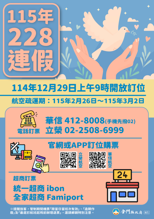 金門縣府提醒鄉親及旅客,此次連假於尖峰時段115年2月26日至28日臺灣出發往金門方向,及2月28日至3月2日金門出發往臺灣方向之機票,均會加註「限當日當班次」、「逾期作廢」之使用限制,俾使有限之空運資源獲得更有效之利用。