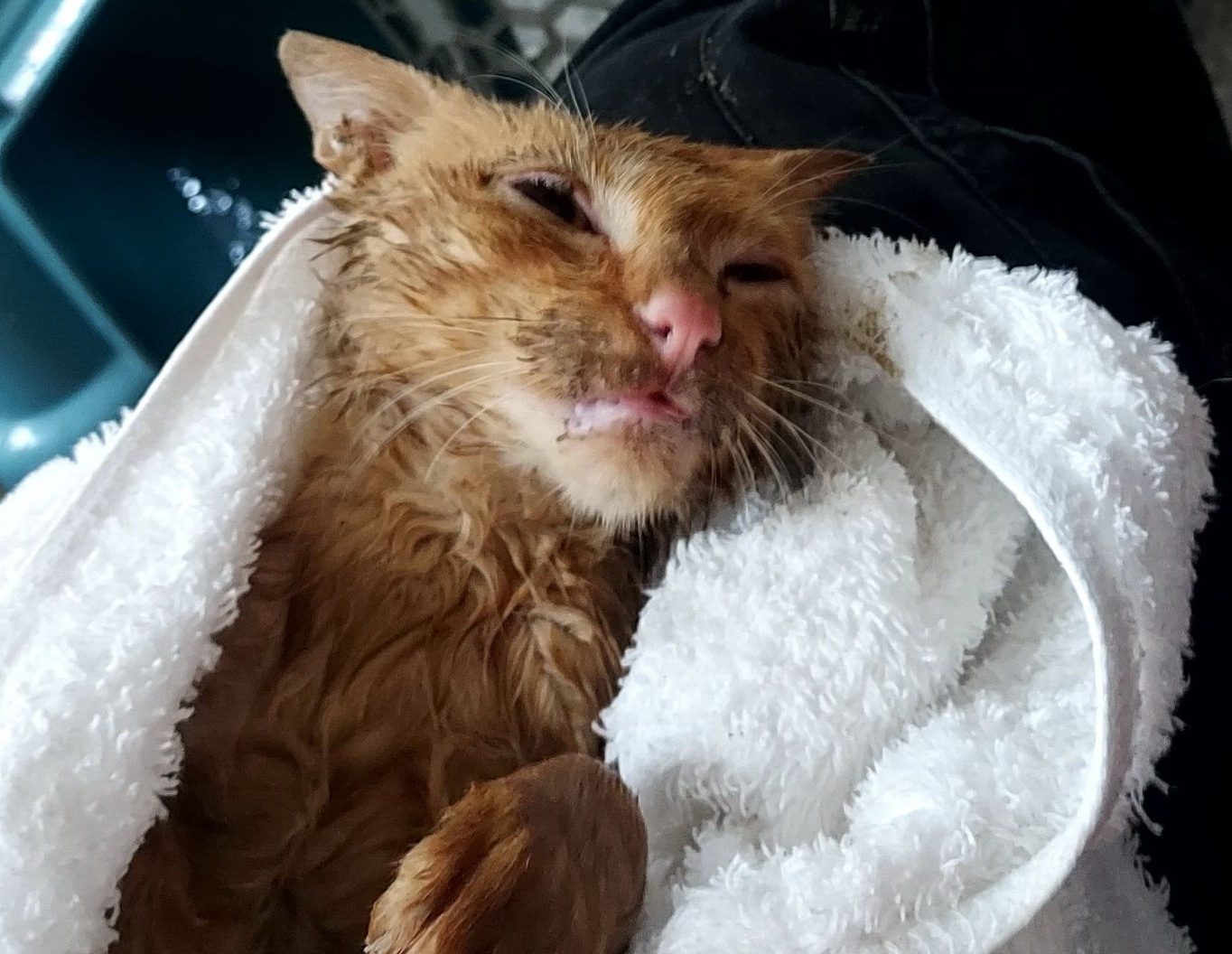 醫療中心動保員表示,小橘貓經過保暖及毛髮乾燥恢復體力後,吃起軟質營養品,吃得滿臉都是,模樣超級可愛,很高興牠沒有外傷也沒有受寒感冒,並且找的幸福溫暖的家。陳姓飼主表示,聽到小橘貓受困水中及住院休養的情況時,很心疼牠之前的遭遇,一定會好好疼牠給牠一個溫暖的家。