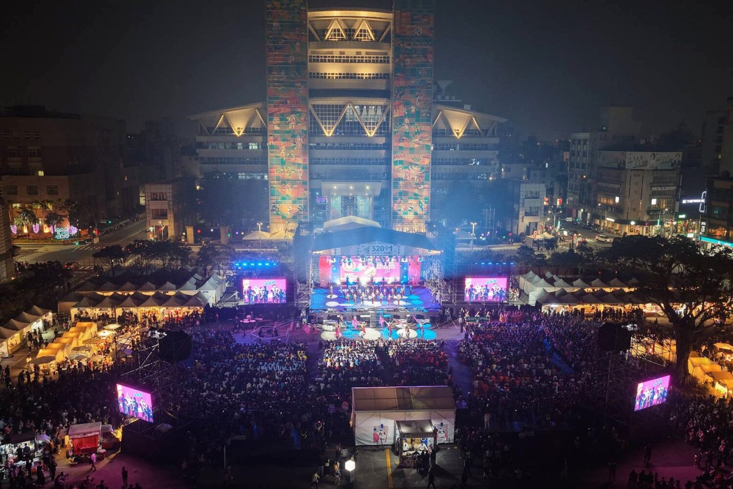 「320+1嘉義市城市博覽會」民眾實際感受嘉義美好,也透過互動裝置,市集等,感受滿滿幸福。嘉義噴水池互動展演超人氣,民眾的照片、心裡話透過投影,互動光影展演,結合大型環形LED裝置、動畫藝術,讓傳統地標以嶄新姿態走入「夜間城市展演」的新時代。