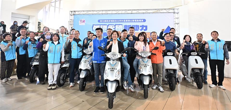 彰化縣政府為提升村里服務效能,同時落實環境永續與淨零碳排目標,今(29)日上午於縣府中庭舉辦「電動機車新上線、村里服務更升級-彰化縣政府補助各公所村里業務公務電動機車記者會」,彰化縣長王惠美與會。王縣長表示,感謝議長謝典霖及所有議員對經費的支持,縣府推動各鄉鎮市公所電動機車補助計畫,公所可依地方特性及需求,採購村里業務公務電動機車,全縣共591村里,每輛補助上限6萬2,000元,總經費3,664萬2,000元,將低碳交通落實於各村里的公共服務。