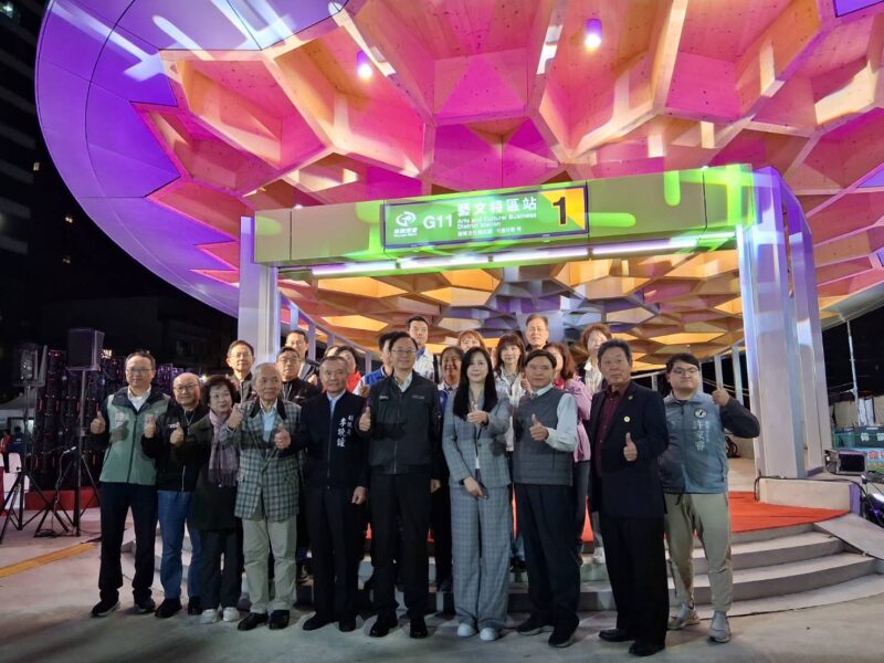 G11站出入口A是國內捷運工程中,首度採用鋼木構造設計(CLT),結合鋼骨支撐與環保木材,兼具結構強度、美觀與永續性,展現環保減碳、耐震耐久與美學設計等特色。車站位於藝文特區前緣,作為市區段的門戶,未來將與藝文廣場及周邊商業區串聯,形塑交通與文化融合的城市意象,出入口A點亮為綠線市區段的重要里程碑。本次點燈,透過專業的照明設計,在夜間精準勾勒出鋼木構架的優美線條,讓藝文特區增添一道亮麗的風景線。