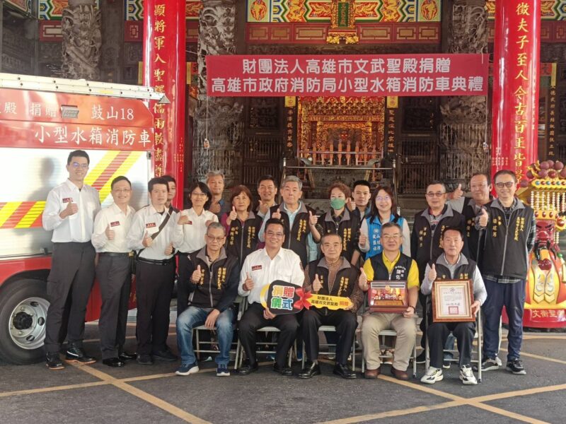 高雄在地信仰中心、長期投入社會公益的「文武聖殿」,為感念消防人員辛勞並提升都市救災效能,於今日舉行消防車輛捐贈典禮。由文武聖殿董事長楊勇男代表捐贈一輛「小型消防水箱車」予高雄市政府消防局鼓山分隊,並由邱榮振副局長代表受贈並回贈感謝狀 。