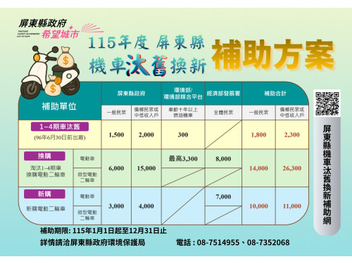 屏東縣政府指出,老舊燃油機車排放的污染物較高,是影響空氣品質的重要因素之一,透過補助對象與車型的放寬,希望讓民眾「換車更有感」,也讓空氣品質改善看得到。縣府提醒,補助期間自 115 年 1 月 1 日起至 12 月 31 日止,民眾可至屏東縣政府環保局網站(便民服務 > 民眾申辦項目 > 線上申請)查閱或直接撥打服務專線 08-7352068 洽詢。為響應環保,請依線上申辦系統流程完成申請。