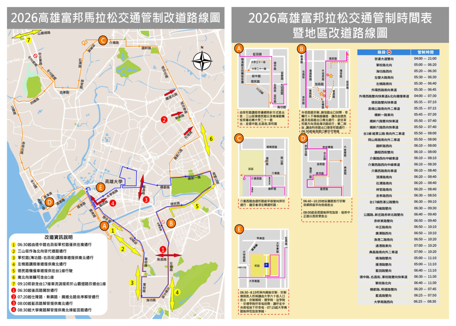 2026高雄富邦馬拉松1/10-11賽事期間實施交通管制請市民配合改道行駛。〈圖/記者翻攝-下同〉