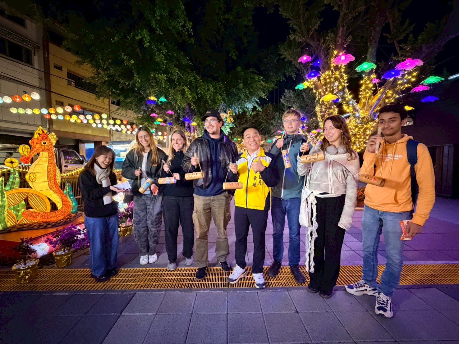 國際交換學生們漫步燈區,欣賞各式別具巧思的竹藝燈座,對於竹材能轉化為大型藝術裝置感到相當驚艷。竹山鎮長陳東睦更化身導覽人員,向國際交換學生介紹燈座的設計理念及創作特色,學生們邊逛邊拍,氣氛相當熱絡。絢麗的主燈秀更是驚艷全場,現場學生紛紛拿起手機紀錄下這精采時刻。此外,燈會現場亦設有多輛美食攤車,提供特色餐飲,讓學生們在欣賞藝術之餘,也能品嚐臺灣在地美食,感受竹