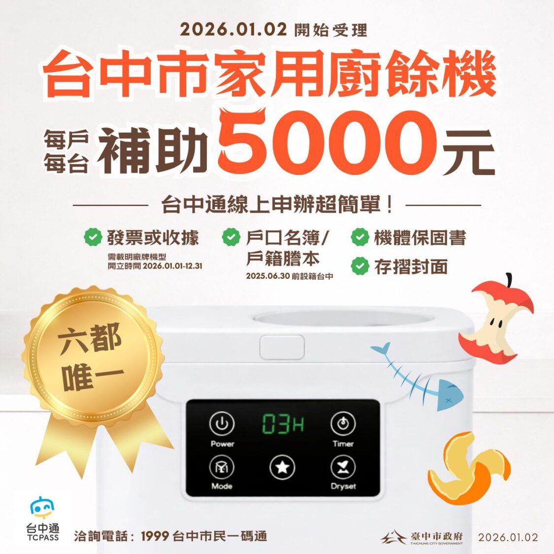 此篇文章最開始出處為: 全國最多!台中廚餘機補助萬台 首日受理即破2,000件 市府嚴審防卡位
