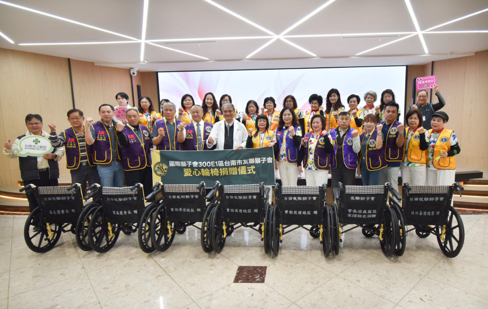 台南市立醫院院長蔡良敏表示,感謝國際獅子會與台南市友聯獅子會長期支持醫療照護需求,除5年前捐贈30台輪椅、去年捐贈百支愛心傘外,今年再加碼捐贈60台輪椅;輪椅是臨床上使用率極高、也最容易耗損輔具,這批嶄新輪椅對病患移動安全有極大幫助。