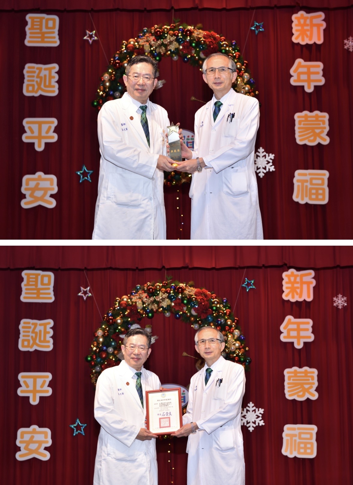 圖說:兒童醫院院長陳治平(右)將典範獎獻給總院長張文瀚,張文瀚特別感謝團隊的努力,肯定團隊在專業、信念與使命上的共同堅持。圖/馬偕醫院臉書