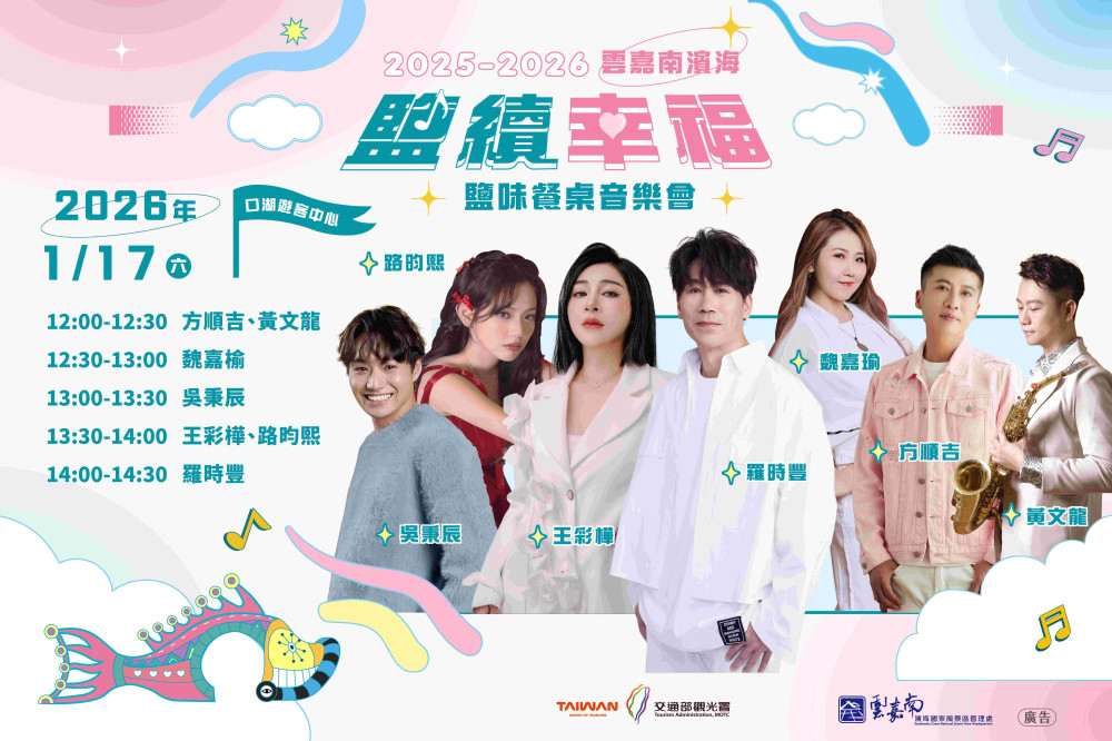【勁報記者杜忠聰/臺南報導】交通部觀光署雲嘉南濱海國家風景區管理處將於 115 年 1 月 17 日(星期六)中午,在雲林口湖遊客中心舉辦「2025-2026 雲嘉南濱海 — 鹽續幸福・鹽味餐桌」音樂會,邀民眾品嘗在地農漁產美食,欣賞知名歌手演出,即日起開放報名至 1 月 12 日。