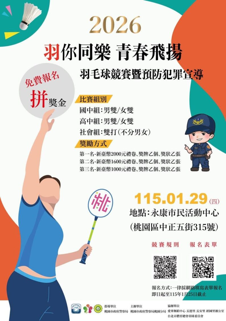 其中重頭戲「羽你同樂、青春飛揚」羽毛球競賽,將於115年1月29日(星期四)上午8時至下午5時,在桃園區永康市民活動中心登場,由桃園市政府警察局指導、桃園分局主辦,並邀請愛華舞蹈中心、長德里辦公室、長安里辦公室、經國里辦公室共同協辦,展現警民合作守護少年成長的決心。