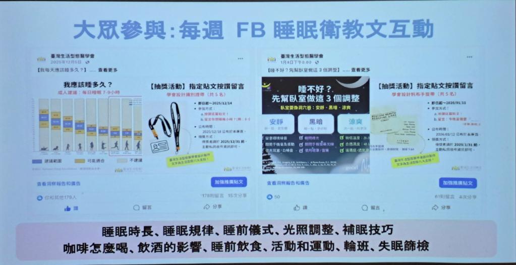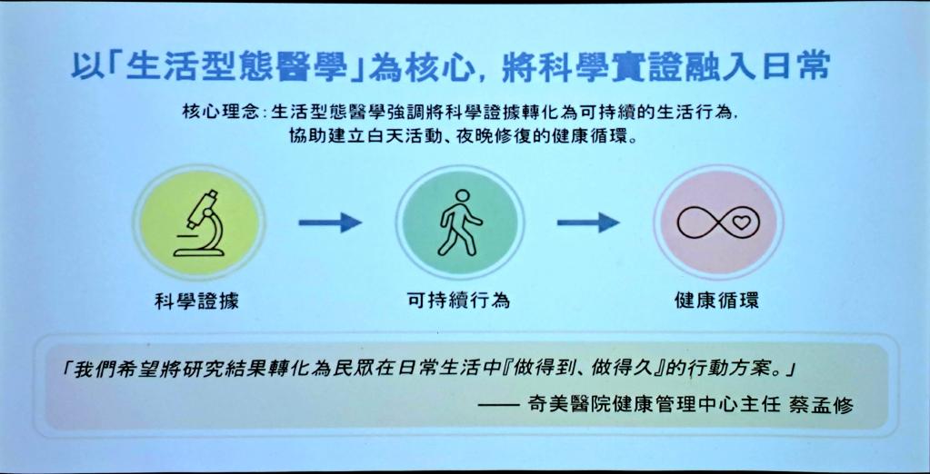 奇美醫院健康管理中心主任暨臺灣生活型態醫學會秘書長蔡孟修指出,根據近年大型隨機對照研究與系統性回顧分析(如Frontiers in Psychology,2024),及美國身體活動指引(PAGA),實證顯示規律運動與日常身體活動皆能有效調節生理節律,並提升夜間入睡品質與整體睡眠表現;生活型態醫學強調不只是「運動量」,而是將科學證據轉化為可持續生活行為;臺灣生活型態醫學會此次參與「醫起好眠八週挑戰」內容設計,正是希望將研究結果轉化為民眾在日常生活中「做得到、做得久」行動方案,協助建立白天活動、夜晚修復健康循環。