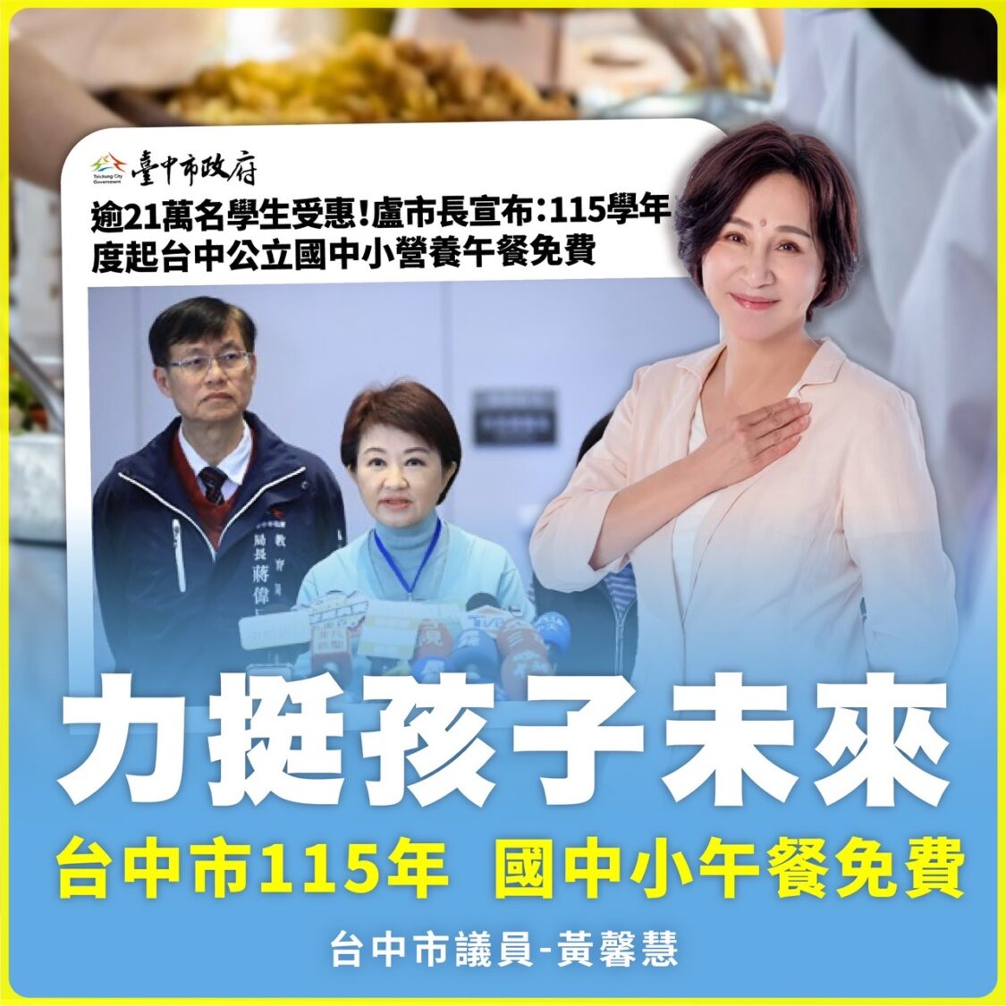 為落實教育公平、守護學童健康成長,台中市議員黃馨慧長期關注學童營養與校園教育資源分配,積極支持台中市政府自 115學年度起,市立國中小營養午餐全面免費 的政策,讓孩子在學習路上不因家庭經濟而挨餓,真正實現「不讓任何一個孩子餓著學習」。
