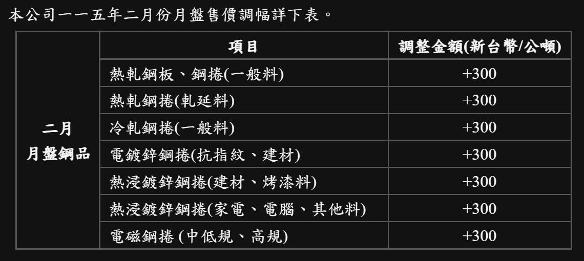 中鋼表示,全球鋼市歷經去年調整後,剛性需求開始釋出,終端庫存水位偏低,供需結構改善,有助啟動補庫存循環,鋼價有機會進入新一波上升週期。因應國際鋼價走揚及煉鋼成本持續增加,中鋼決議對2月份月盤產品進行適度調漲,以合理反映成本,同時依不同產業需求持續推動多元配套方案,強化下游接單動能。中鋼也呼籲客戶把握市場轉折契機,及早建立庫存,共同迎接鋼市向上發展的新階段。