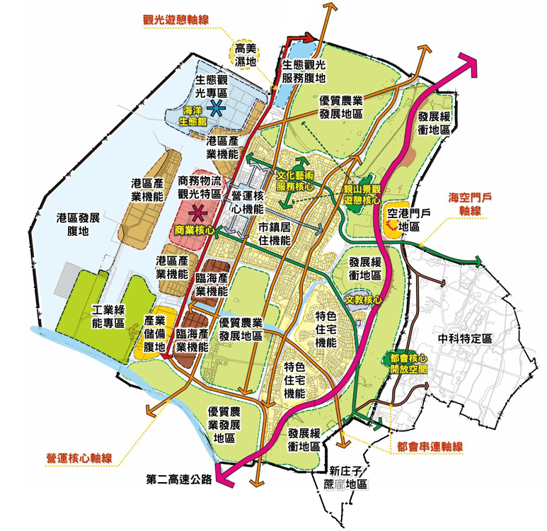 除針對地區需求及發展辦理土地使用及公共設施檢討調整(如高美濕地及麗水漁港周邊地區劃設遊憩服務用地,針對公園用地、學校用地及機關用地進行適度調整)、都市計畫重製及樁位疑義處理等調整外,為進一步簡化審議程序,辦理主細計分離作業以強化地方自治彈性及公共設施機能,逐步落實「雙港核心」的市政願景,帶動海線整體繁榮發展,成為兼具陸海空三港便捷運輸的國際化重鎮及高價值、高增值的運籌基地。