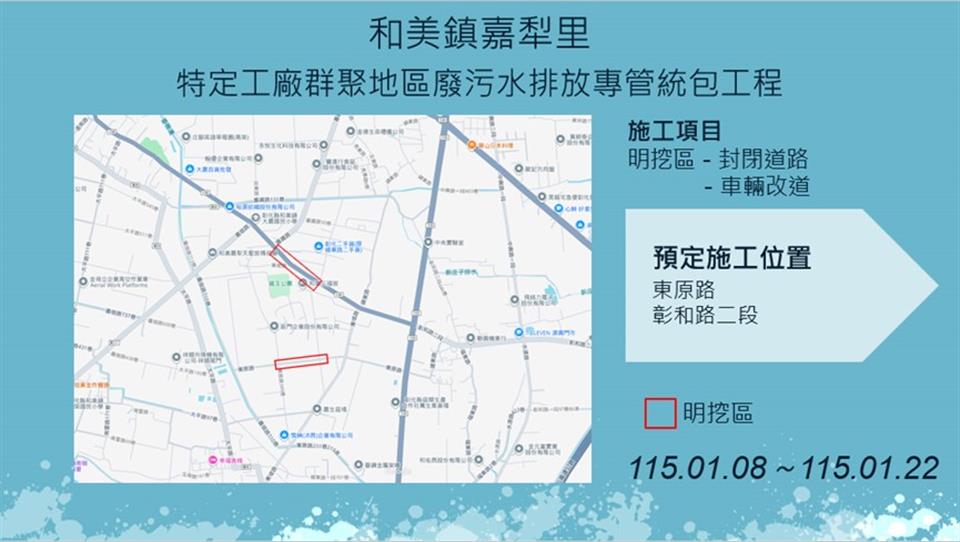 彰化縣政府水利資源處於彰化市茄苳里及和美鎮嘉犁里進行特定工廠污水排放專管建設工程,於115年1月8日至115年1月22日預定施工範圍及管線施工路段,如圖示,工程採分段分區方式施工,相關期程將視現場施工情形調整,部分路段實施車道分流及縮減,敬請多加小心!此篇文章最開始出處為: 【彰化市茄苳里、和美鎮嘉犁里特定工廠廢污水排放專管工程施工公告】